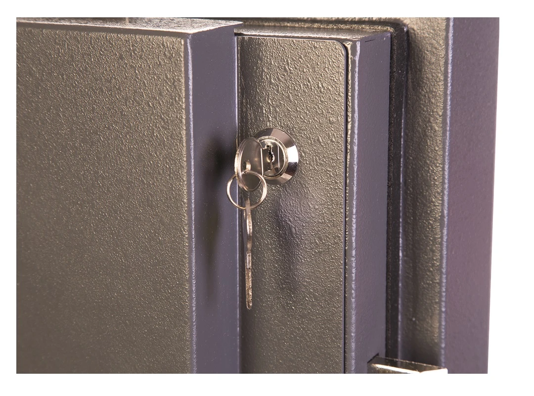 - Сейф HS2051E оборудуется четырёхсторонним ригельным механизмом, представленным четырьмя прямоугольными стальными ригелями 100×10 мм – выдвигающимися с трёх сторон, а также пассивными (неподвижными) со стороны петель.