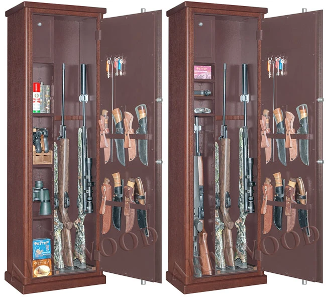 - Внутри сейфа есть запираемое (патронное) отделение и деревянные ложементы, можно дополнительно установить три съёмные полки (если полки не устанавливать в сейф помещается 5 стволов).