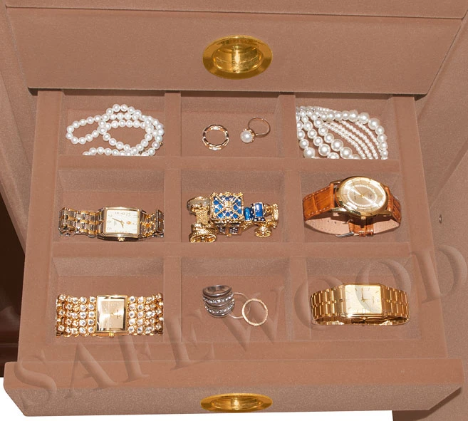 - Корпус имеет двойные стальные стенки, наполнитель – бетон. Вверху корпуса есть отдельное запираемое отделение, ниже расположены семь выдвижных лотков со вставками для хранения часов или ювелирных изделий. На металлические детали сейфа нанесено коррозионно-стойкое полимерное порошковое покрытие.