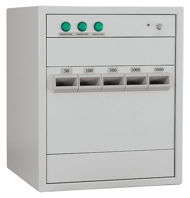 Нижний ящик снабжен 5-ти секционной кассетой для хранения депонируемых банкнот раздельно по номиналам. Вместимость одной секции до 1500 купюр (в пачках)