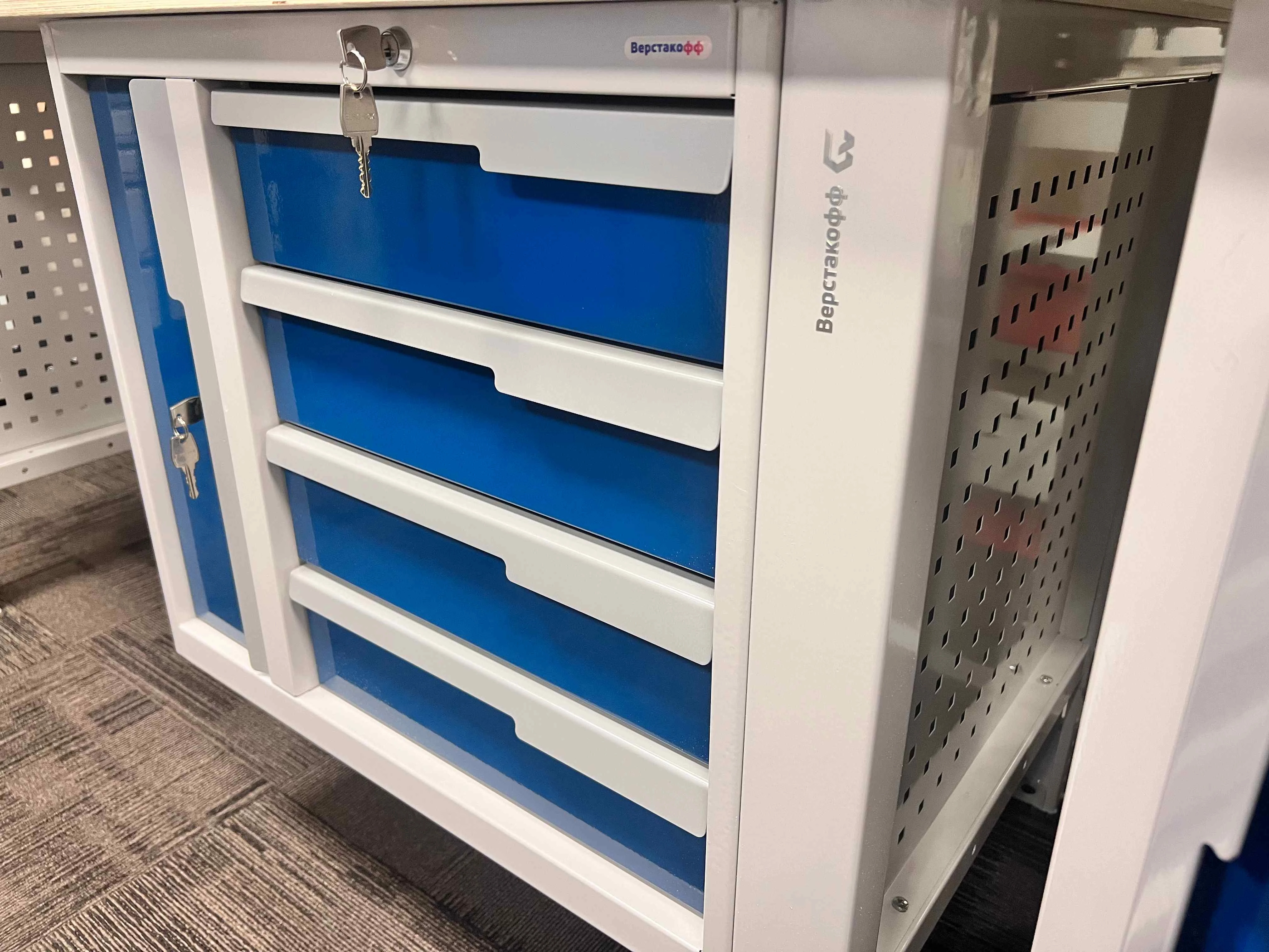 - Рабочее пространство становится более удобным за счёт разнообразных модулей с ящиками и тумбами, а также благодаря возможности установки одной или двух перфорированных панелей для хранения инструментов и навесных элементов.